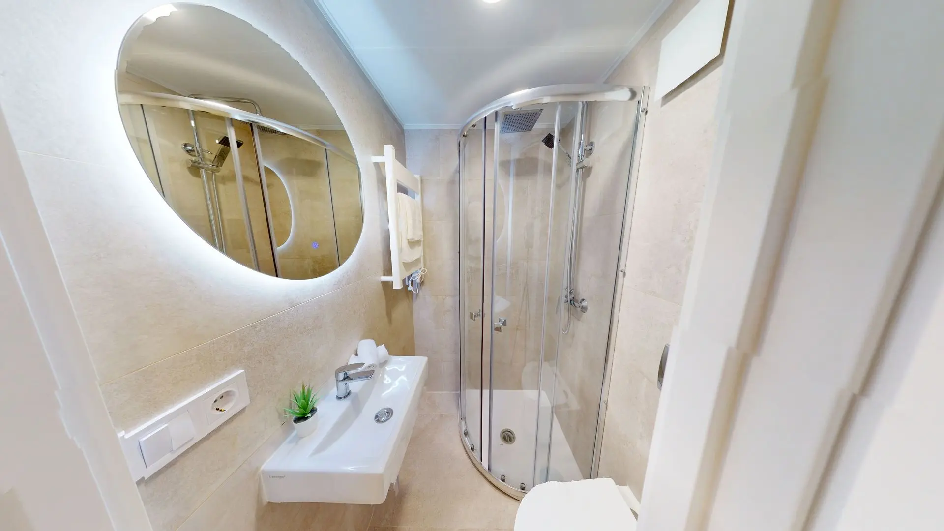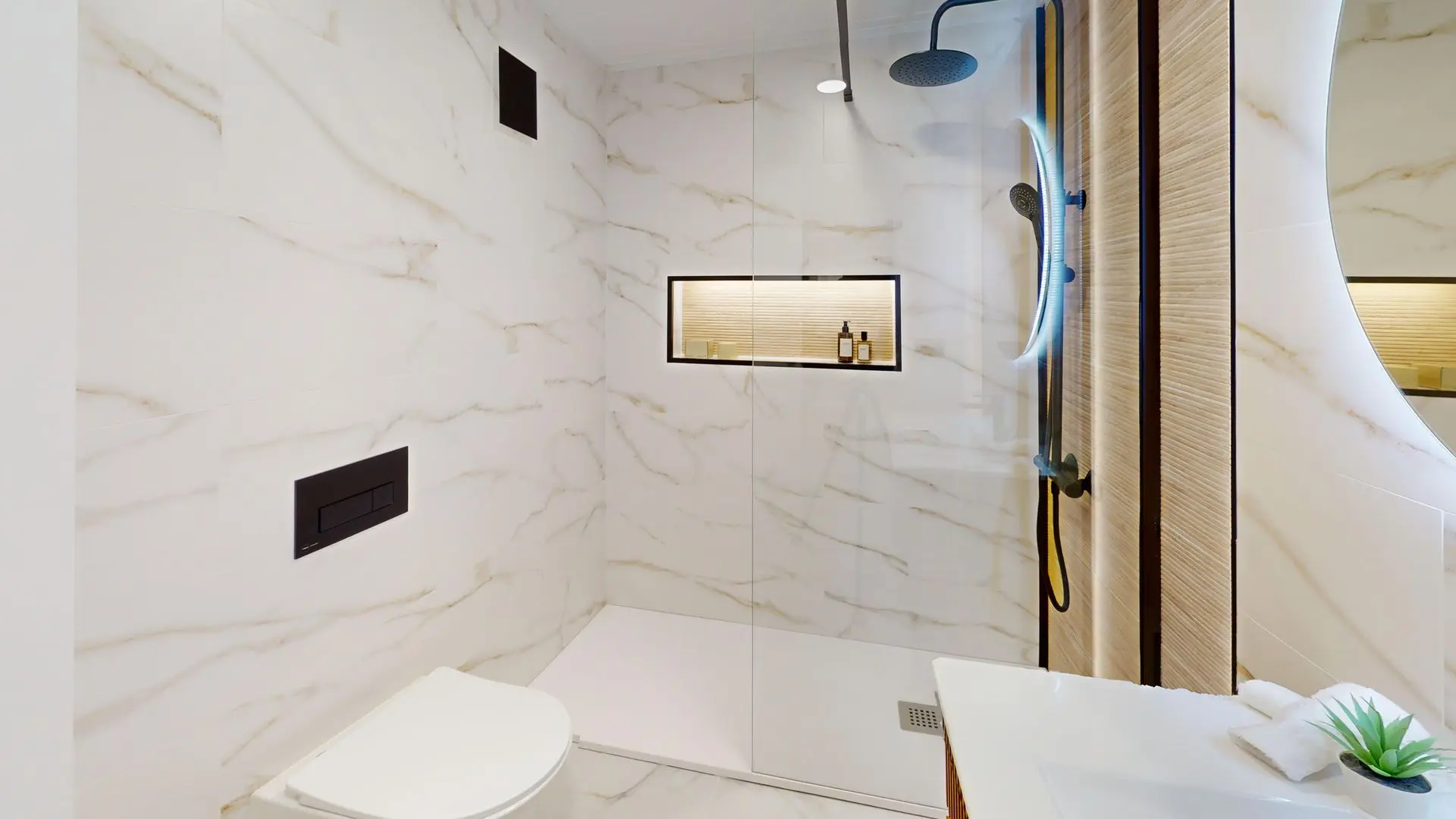 La zona de descanso incluye dos dormitorios tranquilos y luminosos. El dormitorio principal, de 14 m², invita al descanso con su atmósfera serena. La vivienda cuenta con dos baños completos de estilo contemporáneo; el principal incorpora una hornacina en la ducha y una iluminación LED ambiental que transforma el espacio en una auténtica zona wellness.