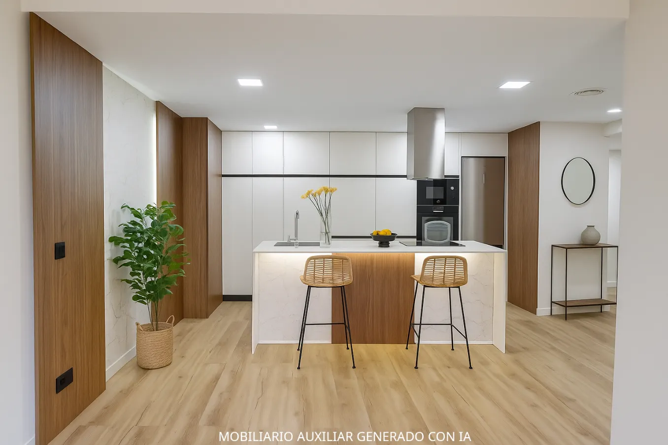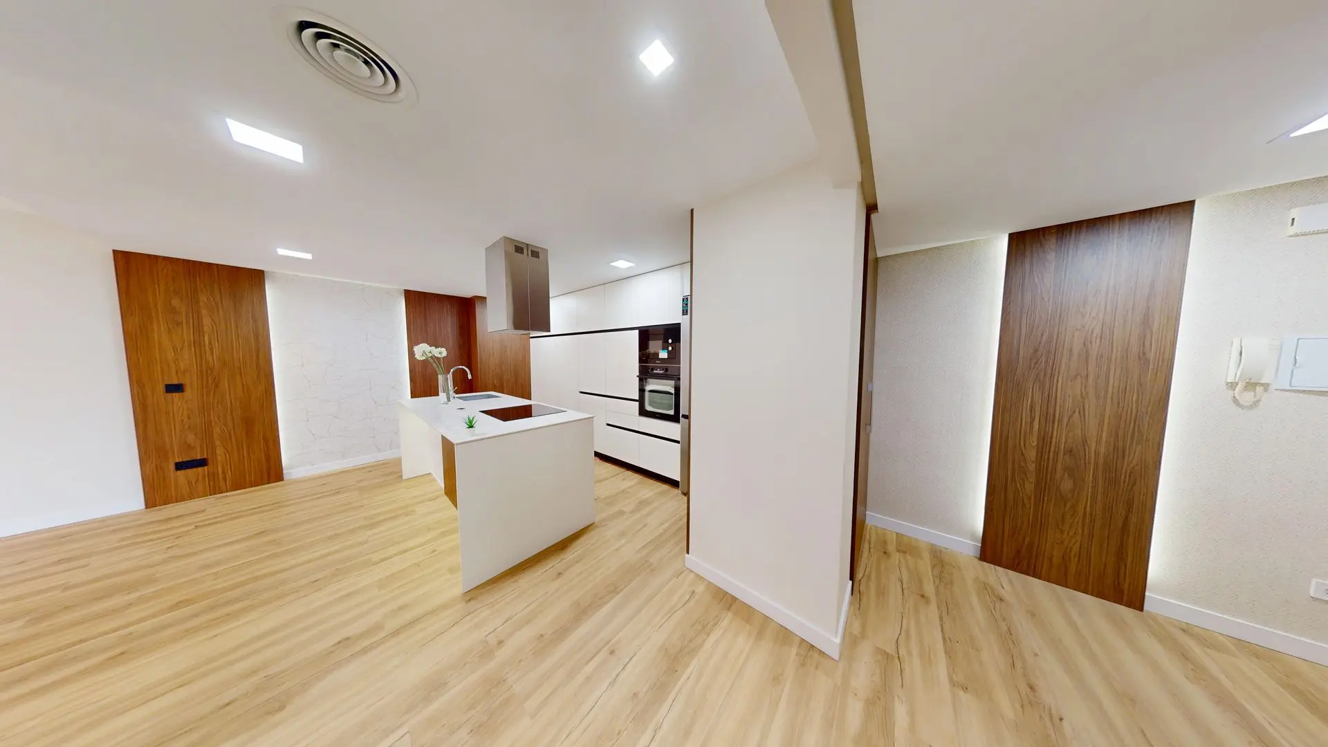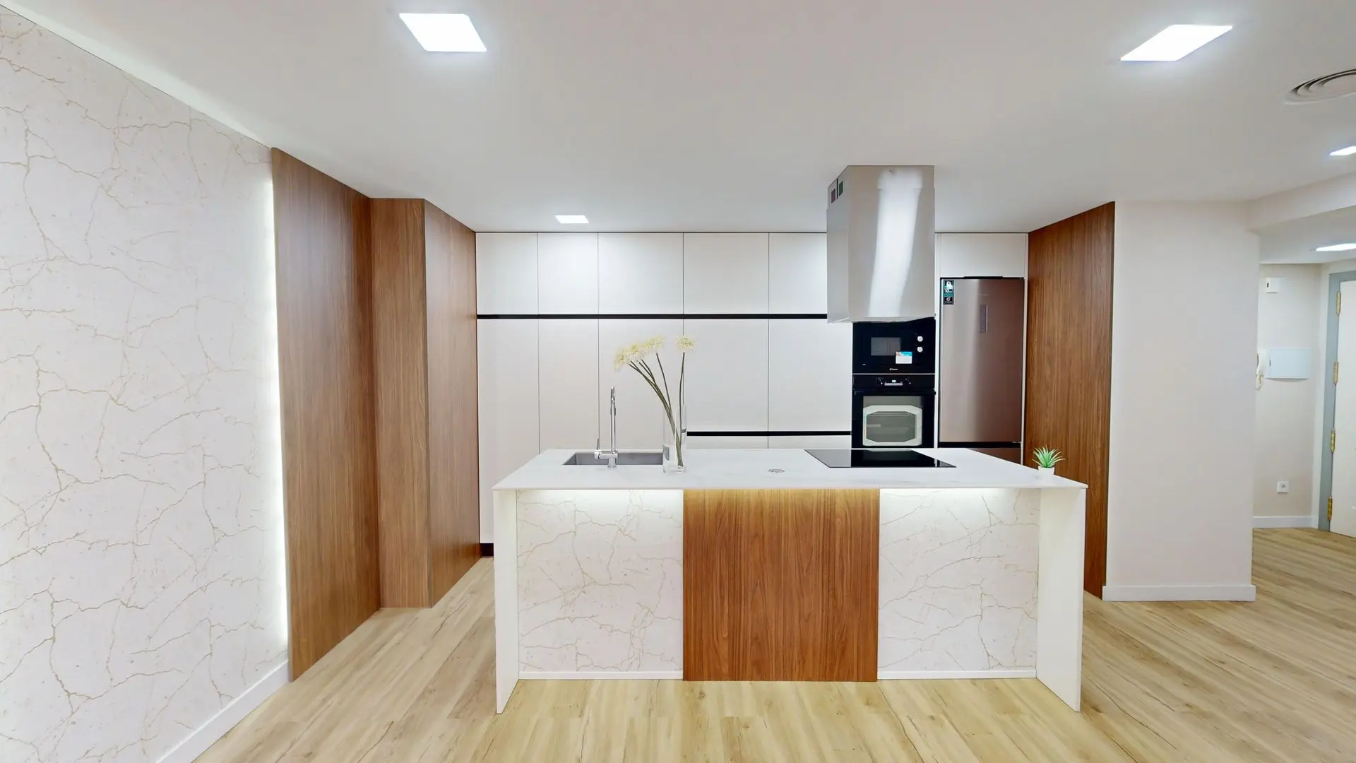 La zona de día se distribuye en un amplio espacio abierto que conecta salón y cocina, ideal para disfrutar en el día a día o recibir invitados con estilo. La cocina, de inspiración minimalista, combina armarios en blanco roto con cálidos detalles en madera nogal. La gran isla central con encimera porcelánica efecto mármol con detalles dorados incorpora fregadero y placa de inducción, y se completa con electrodomésticos de primeras marcas, incluyendo lavavajillas y lavadora integrados.