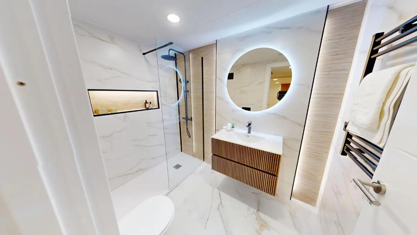 El suelo vinílico de alta resistencia unifica toda la vivienda, aportando calidez y continuidad visual, y ofreciendo gran durabilidad sin renunciar al diseño. En los baños, el suelo porcelánico de alta resistencia refuerza la sensación de calidad y confort. Desde el salón y el dormitorio principal se accede a una terraza privada, un rincón perfecto para relajarse al aire libre.
